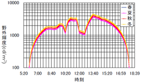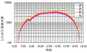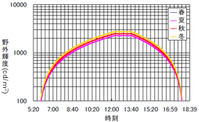 - 5月の晴天時及び8月の曇天時に取得した野外輝度及び等価均一輝度の時刻変動データから,晴天+曇天時のデータを作成し,春を基準とした各季節の相対値を乗じ,晴天+曇天時の各季節の時刻変動を求めた。(図3.8)