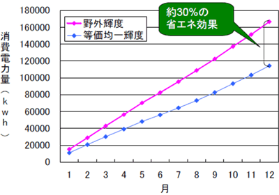 トンネル入口照明の調光制御を,等価光幕輝度の値を基に,きめ細かいステップ調光で行なうと,野外輝度による方式と比較して年間で約30%の省エネ効果(図3.13)があると予測できた。