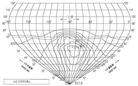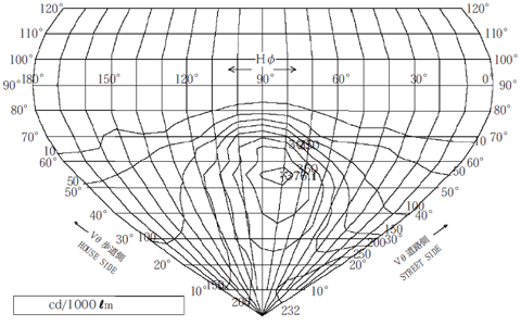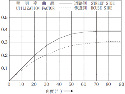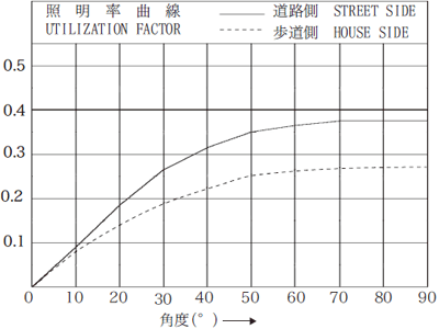 一例として,両口金形高圧ナトリウムランプ用広スパン形器具の従来品(枠付器具)と本商品(枠無器具)の照明率曲線,等光度曲線をそれぞれ図5~図8に示す。