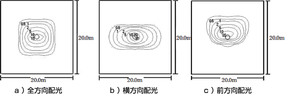 LEDユニットの取付角度を制御することにより,反射板等を用いなくても3種類の配光パターンを実現させた。照度分布図を図3に示す。全方向配光は広場などに,横方向配光は園路などの歩道照明に,前方向配光は交差点部やエリア・コーナー部に,それぞれ最適な配光となっている。