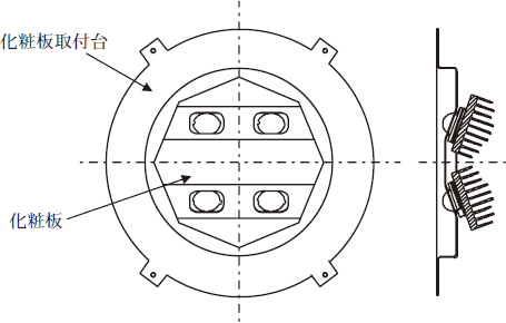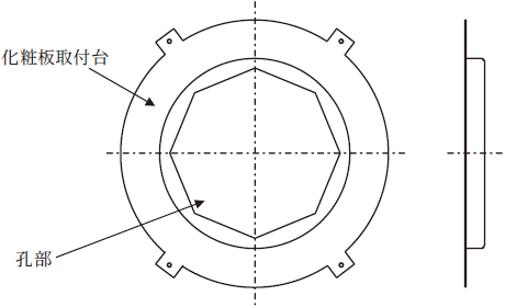 化粧板および化粧板取付台の穴を円形ではなく八角形にすることで,取付ける際のズレを防止するようにした。取付台の形状を図6に,化粧板と組み合わせた状態を図7に示す。