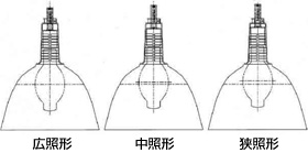目的の配光の位置に目盛りを合わせると,図5のようにランプ位置が動くため配光が可変し,表2のような配光性能となる。なお,ランプがセードの開口径に近づくほど広照形となり,ホルダ側に近づくほど狭照形となる。図6は270W~500Wクラスのランプにおいて広照形となる位置である。