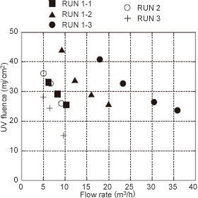図1に各装置における,流量とQβの生残率から計算した紫外線量との関係を示す。RUN1-2で流量9.27m³/h以下の条件では,出口水のファージ濃度が検出限界以下(St<100PFU/mℓ)であった。図1より,紫外線ランプがほぼ同出力な場合,装置Aが紫外線消毒の効率が最も高く,次いで装置B,装置Cであった。このことから,装置容積が大きいほど消毒効率が大きいことが分かった。