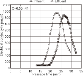 図2に,装置Cを用いたトレーサー実験1の結果を一例として示す。横軸に経過時間(min),縦軸に電気伝導率(mS/m)を示した。実験結果より装置内の滞留時間は一定ではなく,滞留時間分布が存在していることが分かった。尚,他の条件の実験結果からも同様のことが確認されたため,図示は省略する。