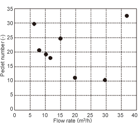 またトレーサー実験2の結果より,流れ方向に対して逆混合を考慮した混合拡散モデルを用い,槽内の滞留時間分布を考え,槽内の流動をモデル化した。照射槽の入口の電気伝導率と,滞留時間分布関数を任意に与え,(1),(2)式より出口の電気伝導率を計算し,実測値と比較検討した。滞留時間分布関数はペクレ数※と平均滞留時間の2変数で表すことができる。その結果,混合拡散モデルで照射槽内の流動をモデル化することが可能であった。図3に一例として照射槽No.1のペクレ数と流量の関係を示す。