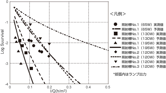 - 実測値は予測値より,安全側であった。これは照射槽内の紫外線の反射等が影響しているためだと考えられた。