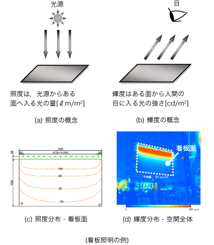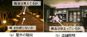 一方,光環境は,その場所および目的に応じて適切な尺度で評価される必要がある。屋外の階段などでは,明るさだけではなく,階段が見えているかが重要になる(図1(a)参照)。また店舗照明では,商品がどれだけ“目立っているか”が重要になる(図1(b)参照)。