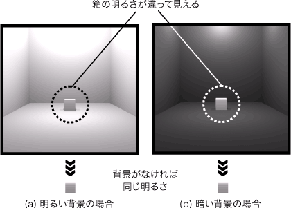 箱の明るさは、部屋の背景の明るさが違うと、違って見える。コントラスト・プロファイル法は、このような対比効果を定量化できる。