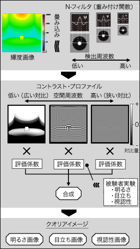 コントラスト・プロファイル法では,輝度画像を空間周波数成分に分解するために,N-フィルタと呼ばれる重み付け関数を,検出周波数を連続的に変化させて輝度画像に畳み込み,空間周波数毎の対比量の状況を表すコントラスト・プロファイル(対比画像)を得る。さらに,これらの出力値に,対比の効果を求めるために,主観評価による被験者実験により求めた評価係数を掛け合わせる。最後にこれらを合成することで,クオリアイメージができる(図5参照)。