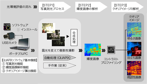 QUAPIXを用いた光環境評価の流れを説明する。はじめに評価対象となる環境の輝度画像を写真測光により測定する。この際,QUAPIXでは,ソフトウェアからUSBカメラの露出を自動制御し合成することが可能である。次に得られた輝度画像に対してコントラスト・プロファイリングを行うことで,各種,クオリアイメージを求めることができる。