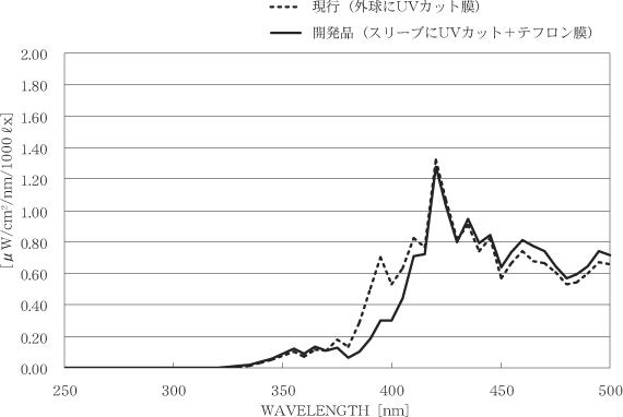 図2に,波長250nmから500nmまでの分光分布測定結果について,外球にUVカット膜を塗布したものと,内管スリーブにUVカット膜,外球にテフロン膜を塗布したものとの比較を示す。同図から紫外線(380nm以下)領域は両者ともほぼ同等にカットされていることが分かる。380nmから420nmで現行品よりも開発品の方の分光分布曲線が下になっているが,これはUVカット膜を塗布している石英製スリーブの温度が高いので,UVカット膜のカット位置が長波長側へシフトしているためである。この分光変化による影響は少なく,現行品と同じランプ特性を得ている。
