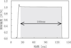 1回の発光中の照度変動に関する特性を図3に示す。有効照射時間(発光後に立ち上がった照度が平坦となる部分)は最大100msである。また,その照度の放射照度時間変動率は,IEC60904-9Ed.2.0にて等級Aである。