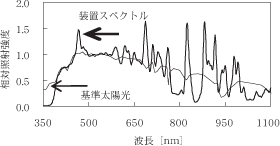 波長λ=550nmの値が1となるよう相対値化した発光スペクトル分布を図4に示す。スペクトル合致度は,IEC60904-9Ed.2.0にて等級Aである。