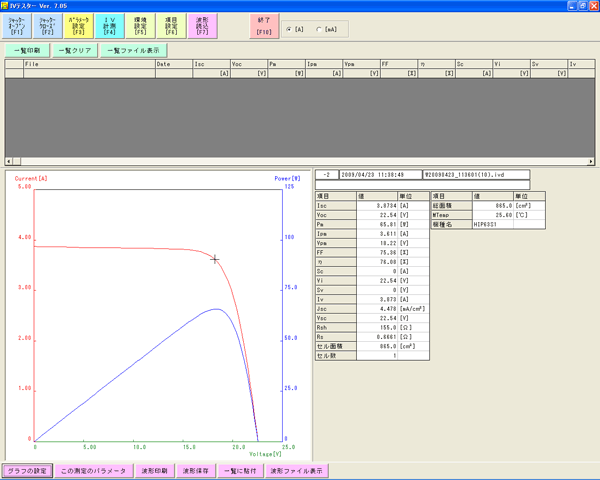 | 測定時間[ms] | Isc[A] | Voc[V] | Pm[W] | Ipm[A] | Vpm[V] | FF[%] |