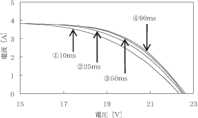 IV測定周期の設定によりIV測定時間を変化させ測定したIV特性曲線を図6に示す。IV測定時間(=IV測定周期×測定回数)は以下4種である。