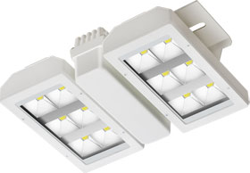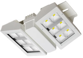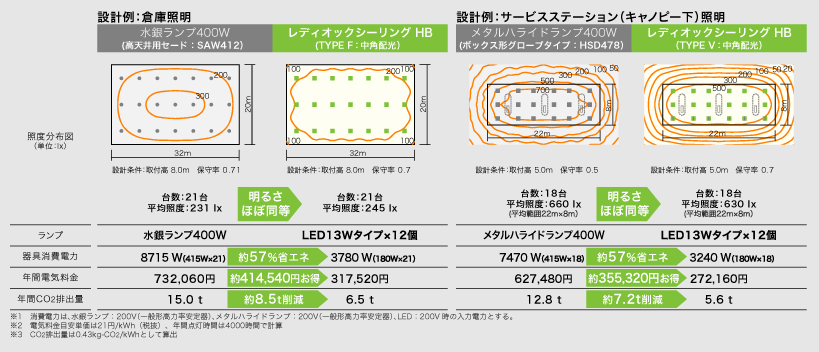 LED光源と3種類の配光パターンの組み合わせで,サービスステーションの他,倉庫照明としても従来品と比較して省エネ,CO₂削減が計れる。