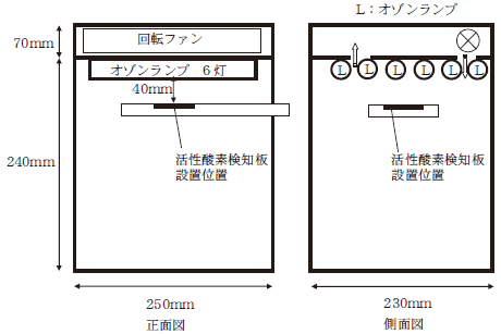 実験装置として図6に示す密閉型紫外線照射ボックス(内容積18ℓ)を作製した(以下ボックスという)。ボックスの構造は活性酸素発生源として6Wオゾンランプ6灯を取り付け,オゾンランプから試料までの距離は10~120mmに可変でき,発生オゾン濃度の均一化のため天面部に回転ファンを設けた。