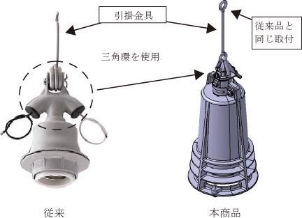 具体的な構造としては,従来品と同じく引掛金具により器具を取り付けることにし,ホルダと引掛金具の間に基本吊具でも使用している三角環を配置し,従来品と同等以上の性能が発揮されるようにした。