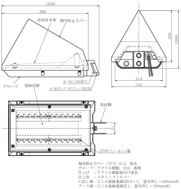 本実験で対象とするLED街路灯氷柱対策品の外観写真を写真1に,器具図面を図1にそれぞれ示す。また,LED街路灯標準品の外観は写真2中に示す。