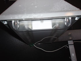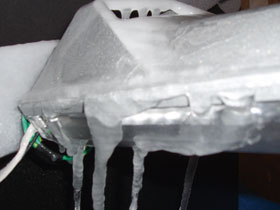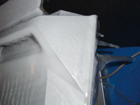 下記に示す写真10及び写真11は,標準品の天面の氷発生状況であるが,最初は器具天面に氷の膜が発生する。その後,時間経過と共に,その氷の膜が,器具の傾きに応じて低い側にて徐々に氷が成長し,器具側面を伝って垂れ下がり鉛直方向に氷柱となり成長する。