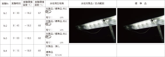 - 氷柱は-20℃程度/湿度70%の(氷点下)環境では,氷柱成長の元である融雪水の発生が抑制される為に,極端な成長は標準品/対策品共に認められなかった。