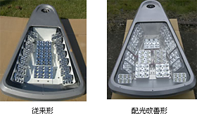更なる配光性能向上を実現するために,反射板構造,LED配置等の見直しを行い,解析ソフトを活用して目標とする配光性能を達成した。図3に従来形との器具内部の比較を示す。
