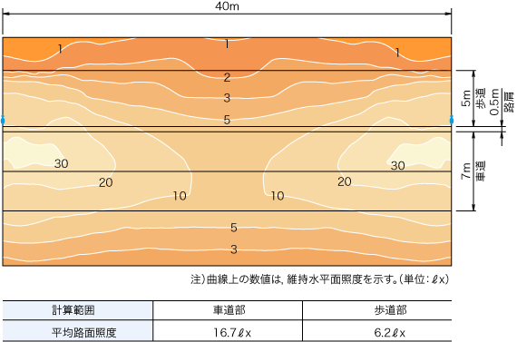 - ※注1:取付高さ10m,取付スパン40m,幅員7mでの1スパン内の路面輝度の目安。
