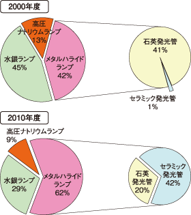 図2は我が国における2000年度と2010年度のHIDランプ種類別の出荷数量構成比を示したものである。2000年度は水銀ランプとメタルハライドランプがほぼ同じ割合であったが,2010年度には水銀ランプが減少し,メタルハライドランプが約60%にまで達している。セラミックメタルハライドランプに関していうと,2000年度における割合はHIDランプ全体のわずか1%程度であったが,2010年度は40%を占め,わずか数年で重要な製品に成長したことが分かる。当社でも,HID製品の中でセラルクスの売上比率は30%にもなり現在の主力製品と言える。