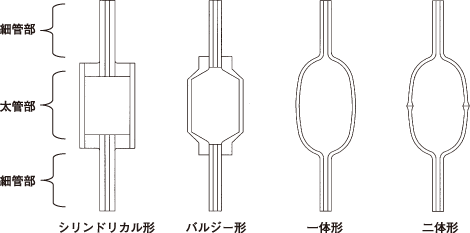 その後,本管部の両端にテーパー部を持たせて発光物質の蒸発を向上させたバルジー形も使用されたが,最近は本管部と細管部を一体物として成形した一体形や,本管部中央で接合する一体形とほぼ同形状の二体形が開発され,現在の主流となりつつある9)。これら形状はシリンドリカル形およびバルジー形の課題であった本管部と細管部接合部の熱ロスが低減され,更なる高効率化が可能となった。