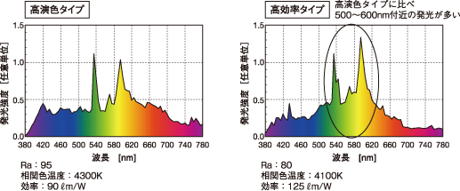 図5に高演色タイプと高効率タイプの分光分布と光学特性を示す。先に述べたように高い光束を得るべくランプの分光分布を分光視感効率曲線に近づけるためには,人の目の明るさの感度が高い緑および黄色成分を増やすことが有効となるため,高効率タイプは500~600nm付近の発光が多い。