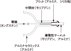 現在,電気導入体としてアルミナとMoの混合物から成る導電性サーメットを使用することが封止部技術の主流となっている。このサーメット方式は熱膨張率をアルミナセラミックスに近づけるだけでなく,耐ハロゲン性も高いといった特長を兼ね備えている。