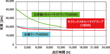セラミックメタルハライドランプは比較的低価格で大光量を得られるが,LEDは素子自体の温度が上がると光束が低下してしまう。そのため,大光量を得るために出力を高くするとそれに反比例して省エネルギー性能は低下し,コストが非常にかかってしまう。さらに,照明器具や点灯装置など設備一式の交換が必要なLEDに対し,既存設備が使用可能なセラミックメタルハライドランプは初期投資も大幅に抑えることが出来る。