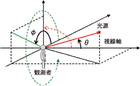 光源の位置は観測者の視線軸となす鉛直角θ[rad]と水平角φ[rad]による極座標系にて表す。